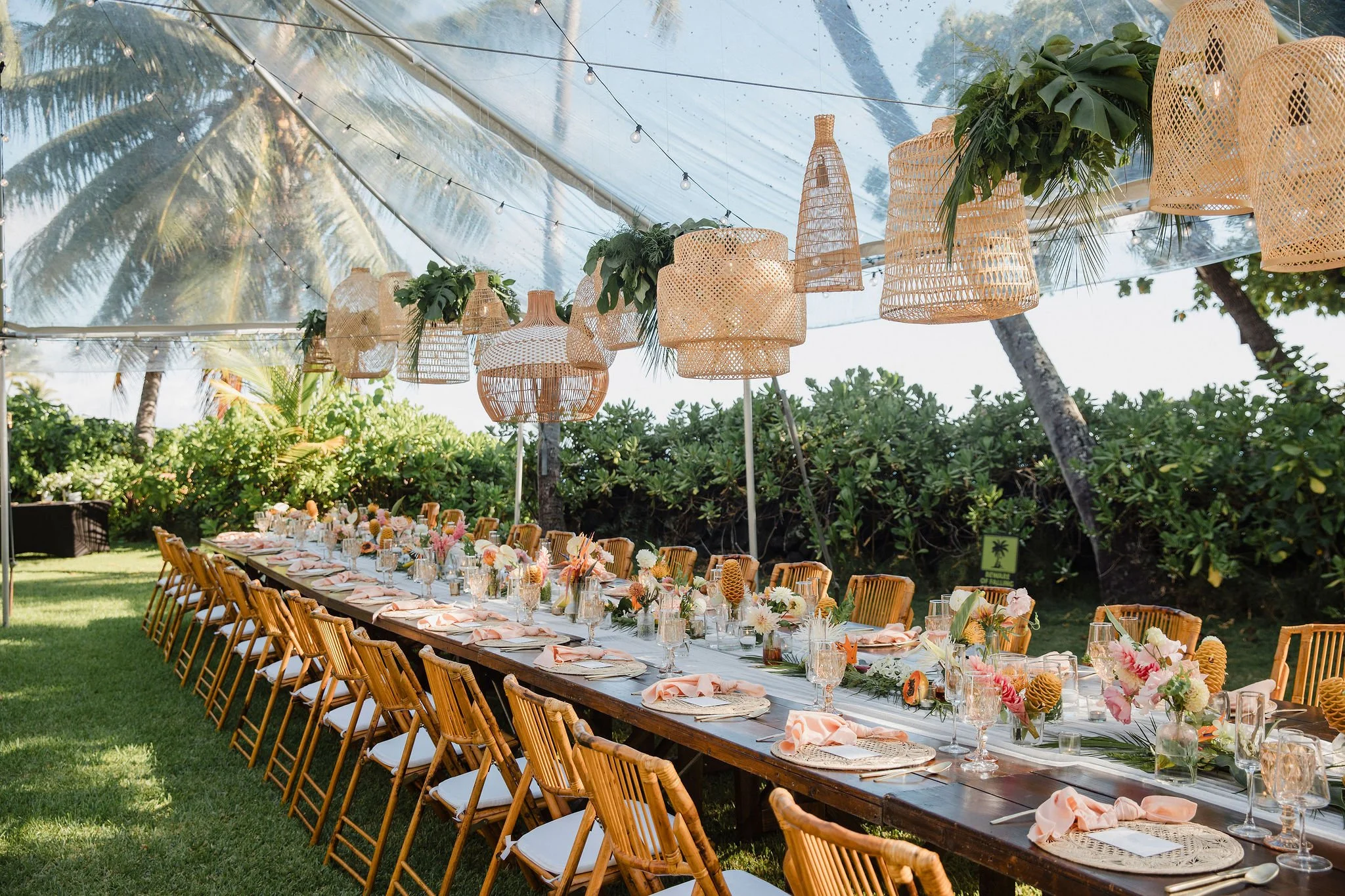 “I recently had the pleasure of working with Kona Event Rentals for my wedding at Holualoa Inn and I must say that their service was exceptional. I highly recommend them to anyone who is looking for a furniture rental vendor for their wedding. The furniture provided by Kona Event Rentals was amazing. Everything from the tables to the chairs was beautifully designed and went perfectly with my wedding theme. The lounge area was also a highlight of the wedding, and my guests enjoyed the couch and little poofs. One of the things that I loved the most about Kona Event Rentals was their attention to detail. The lanterns that dangled above the pavilion and the lanterns that were hung up in the tree were simply breathtaking. The decor and design were exceptional, and I was speechless when I saw it all come together. Kona Event Rentals worked seamlessly with my wedding planner, Kate from Sunshower Wedding. They were able to coordinate and set up everything perfectly, making the planning process stress-free. The team was responsive, accommodating, and professional throughout the entire process, and I could not have asked for better service.”